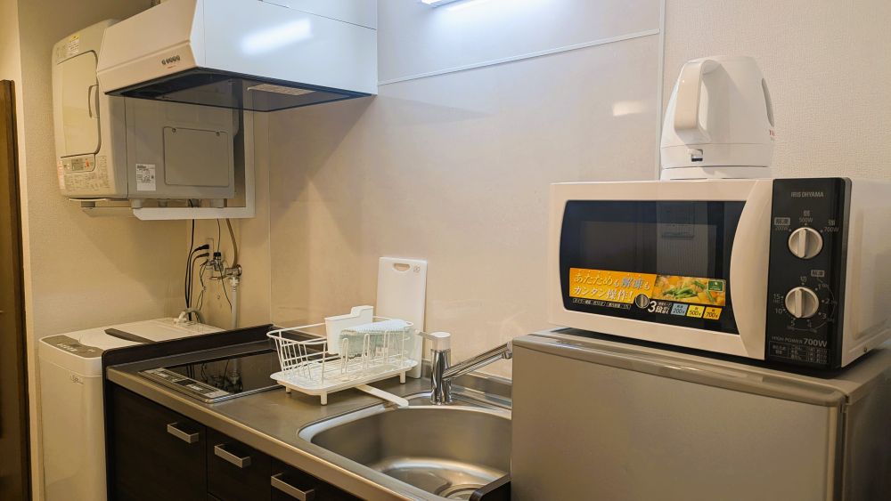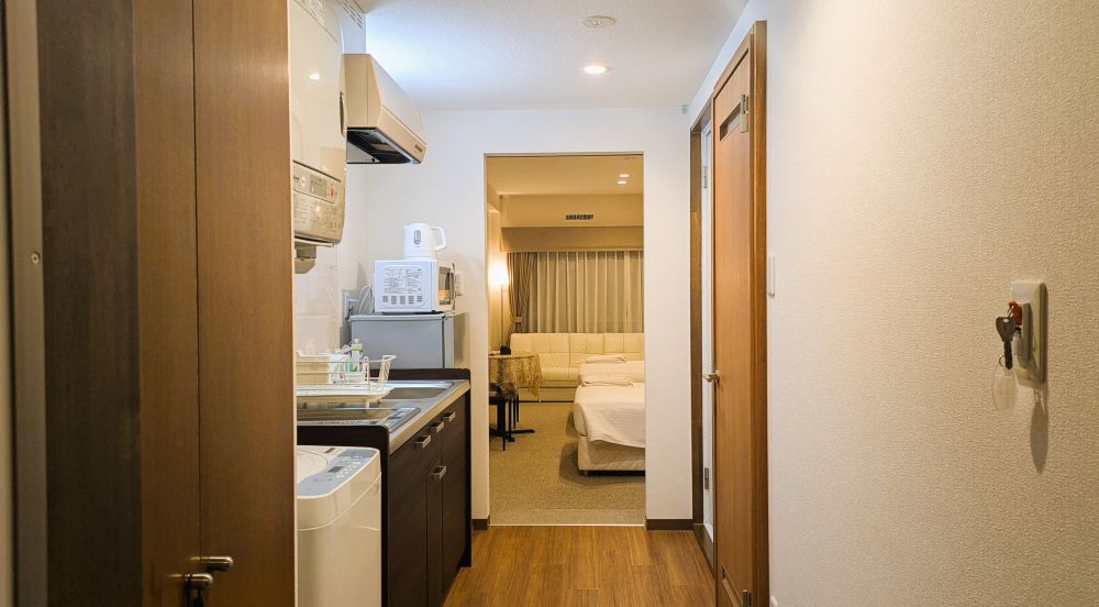 ドアを開けると、左手に下駄箱、洗濯機、シンク、冷蔵庫と並んでいる。
