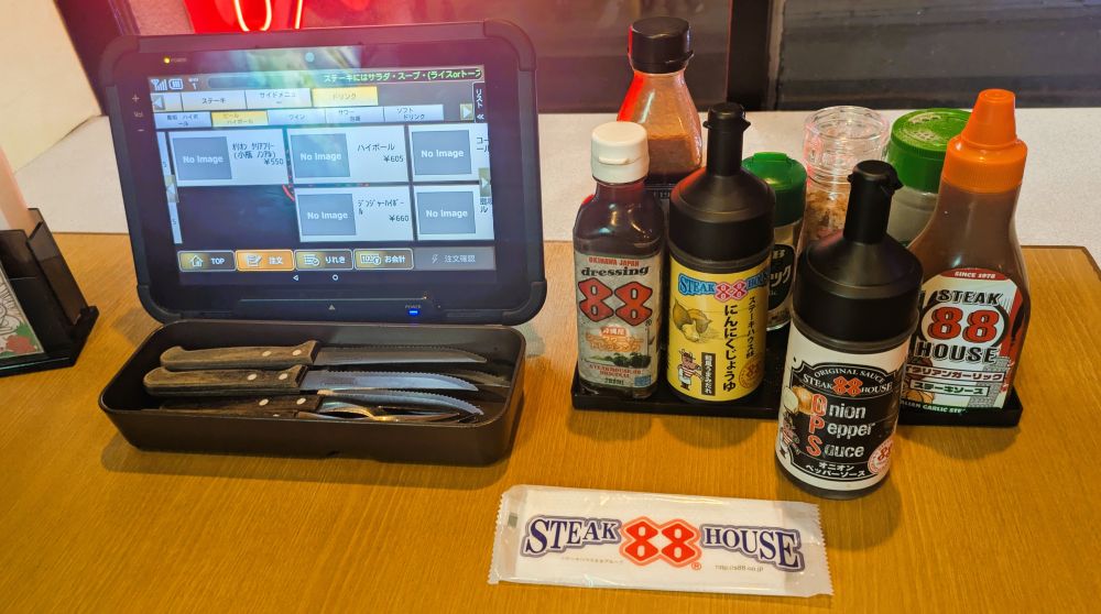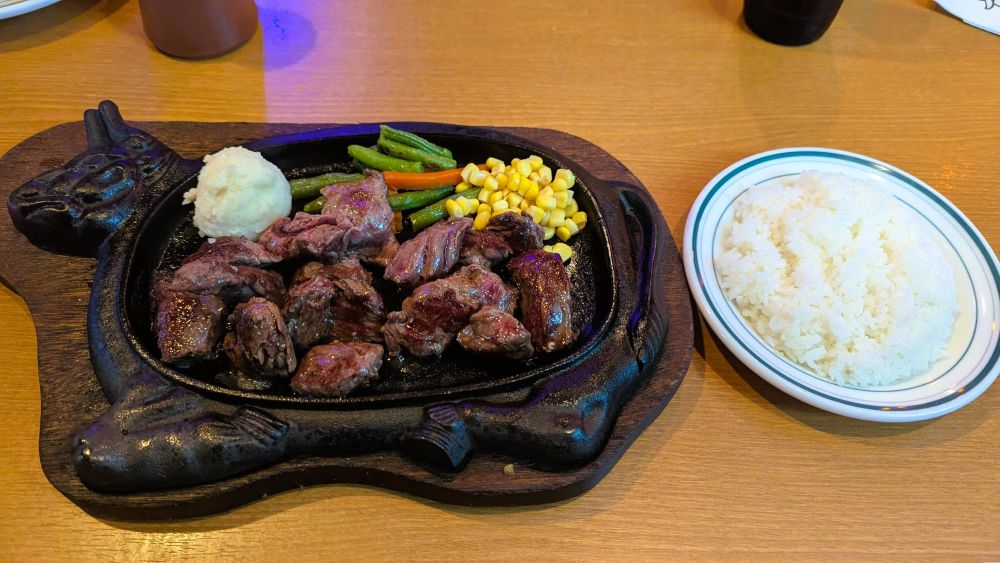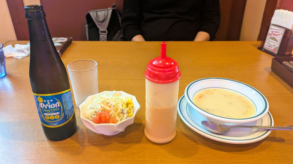 ノンアルコール オリオンビール、ステーキに付いてきたサラダとスープ