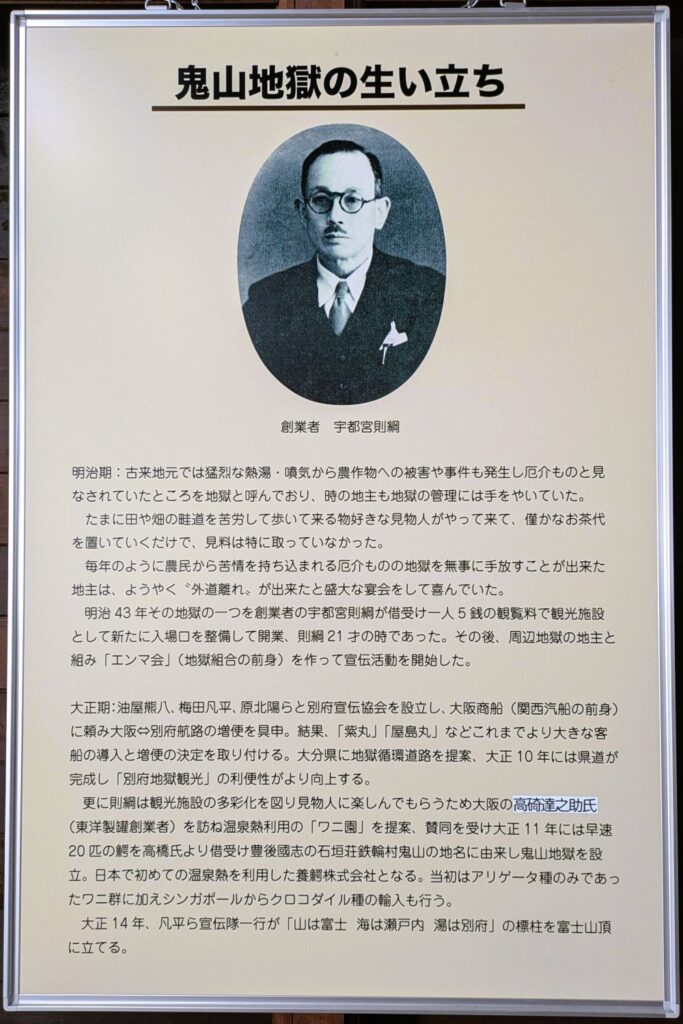 宇都宮氏は、この地獄を近代的な観光地として整備し、ワニ飼育というアイデアを導入することで、別府の地獄めぐりに新たな魅力を加えた人物。