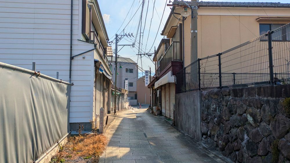 石畳が敷かれ、両脇には情緒豊かな温泉旅館や土産物屋、飲食店が軒を連ねる風情ある坂道。
