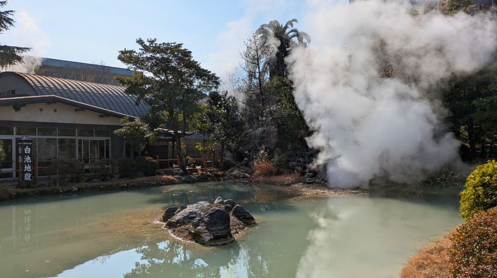 美しい日本庭園の中に静かに佇む白池地獄は、地獄めぐりの中でも特に落ち着いた雰囲気だ。